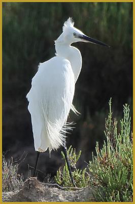 Photo d'une Aigrette garzette ''Egretta garzetta'' au bord des étangs de l'aire de camping car 'Les Poissons d'Argent, à Aigues-Mortes à la fin du mois de juin, dans le département du Gard, en région Occitanie.
