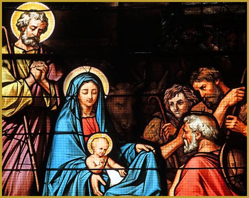 Photo du vitrail du XIXe siècle illustrant la Nativité du Christ, dans la chapelle Sud-Ouest de l'église Saint-Roch d'Aigèze; elle illustre la Vierge Marie qui présente l'Enfant Jésus aux bergers. Histoire de la Nativité de Jésus.