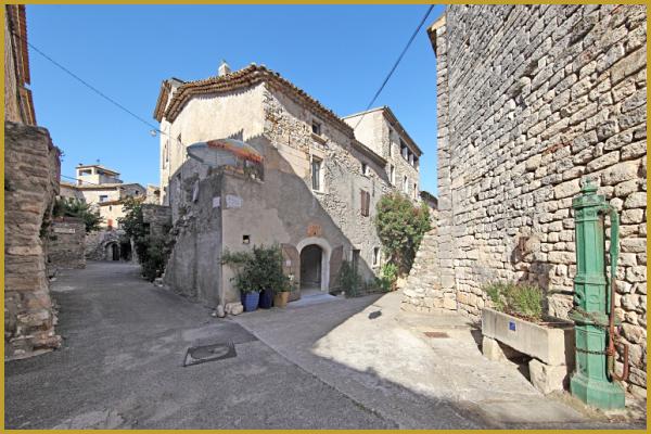 Photo de la rue du Portail Haut, dans ce centre historique du village classé d'Auigèze, avec ses vieilles maisons provençales en pierre calcaire qui se sont élevées au pied de la forteresse médiévale.