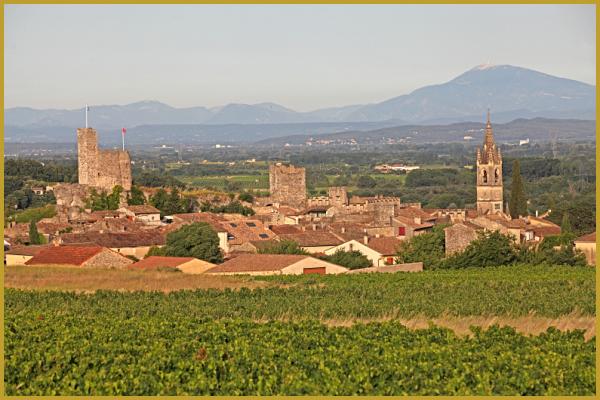 Photo du vignoble des côtes du Rhône, avec le donjon, la tour Sarrasine et l'église Saint-Roche, à Aiguèze au mois de juillet, avec en fond, le Mont Ventoux qui culmine à 1 910 mètres d'altitude, dans le Parc naturel régional du Mont-Ventoux.