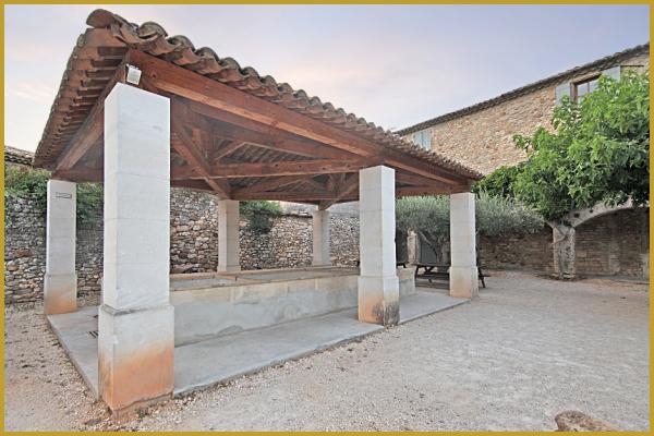 Photo du lavoir d'Aiguèze au coeur de l'été, derrière la mairie et l'office du tourisme, avec son grand bassin rectangulaire divisé en deux bacs, il est alimenté par le trop-plein de la fontaine Saint-Roch situé sur la place du Jeu de Paume.