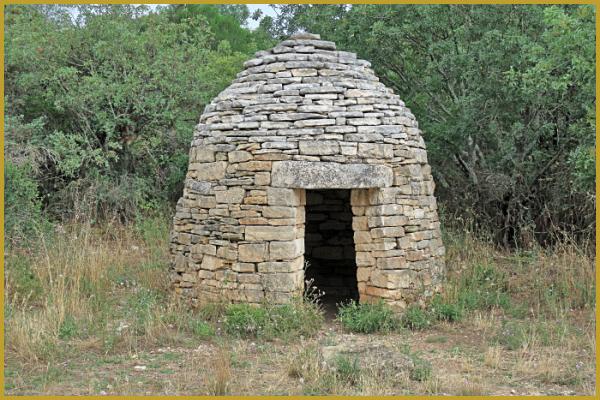 Photo de la capitelle sur le parking du Giet, à Aiguèse au coeur de l'été; une cabane en pierre sèche qui servait autrefois d'abri, ou à entreposer vivres et outils aux viticulteurs, aux pâtres ou aux bergers du département du Gard.