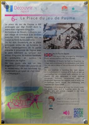Photo du panneau explicatif de la place du Jeu-de-Paum d'Aiguèze, il retrace son histoire et décrit ses demeures crénelées, ses platanes, son terrain de pétanque, sa fontaine et son église Saint-Roch.